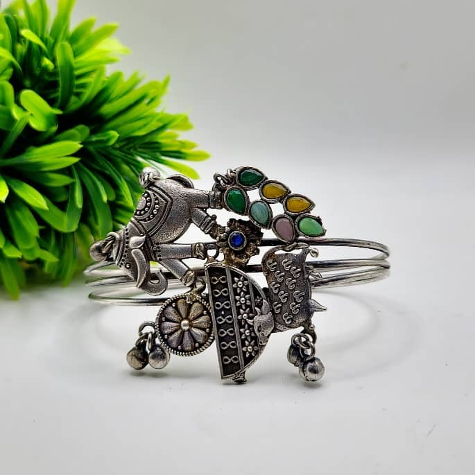 The versatility of the Ancient Spirit Kada makes it suitable for various occasions, from formal celebrations to everyday wear. Whether paired with traditional attire like sarees and lehengas or more contemporary outfits, it enhances any look with its rich and evocative design. The kada can be worn solo for a bold statement or stacked with other bangles for a more layered, dynamic effect.