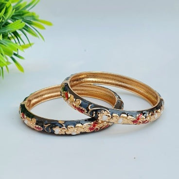 The Black Floral Kada is designed for those who appreciate sophistication and artistry in their accessories. The contrast of black enamel against the floral designs creates a dramatic yet graceful aesthetic, suitable for both casual and formal occasions. Whether worn as a standalone statement piece or paired with other bracelets for a layered look, the Black Floral Kada adds a touch of timeless beauty to any ensemble.