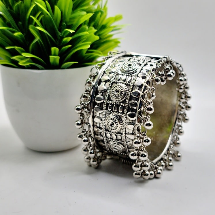 The Grace Bell Kada is the epitome of refined elegance, blending traditional design with a touch of modern sophistication. Crafted with intricate attention to detail, this kada features delicate bells that add a subtle, melodic sound with every movement. Its graceful design offers a perfect balance of simplicity and charm, making it an ideal choice for those who appreciate timeless jewelry. The Grace Bell Kada is made from high-quality materials, ensuring that it not only looks stunning but is also durable and long-lasting. Its elegant appeal makes it suitable for various occasions, from formal gatherings to casual outings, and can be paired effortlessly with both traditional and contemporary attire. Whether you are dressing up for a special event or adding a hint of elegance to your everyday look, the Grace Bell Kada adds the perfect finishing touch to your ensemble. The bells on the kada gently ring with each movement, bringing an added layer of grace and femininity to your style. Comfortable and lightweight, this kada is ideal for all-day wear and can be stacked with other bangles or worn as a statement piece. Its versatile design makes it a popular choice for women of all ages who want to add a touch of grace and sophistication to their jewelry collection. The Grace Bell Kada is also a thoughtful gift for loved ones who value both elegance and tradition in their accessories. Choose this beautiful piece to add a timeless charm to your jewelry collection and celebrate the art of grace in every movement.